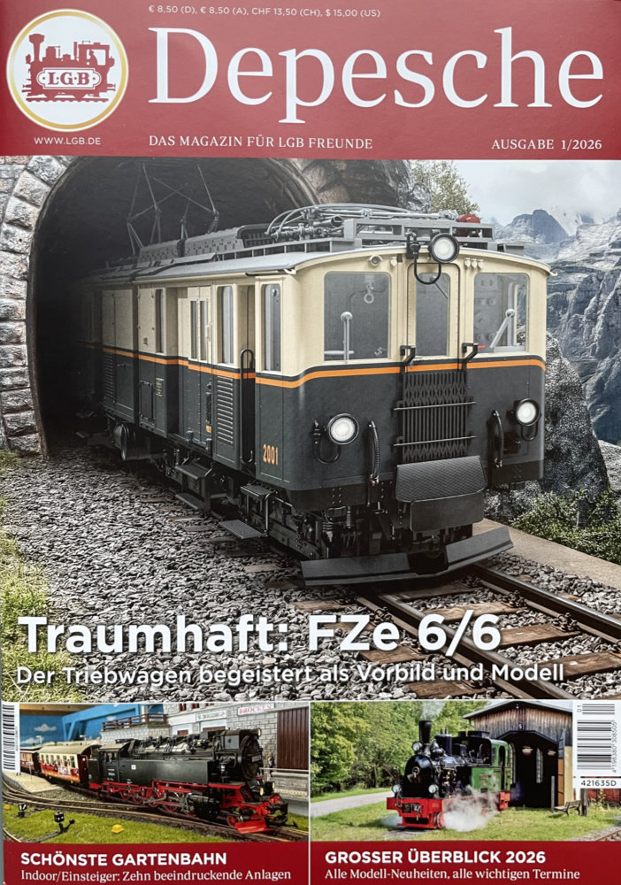 Die neue Ausgabe der LGB Depesche 1/2026 ist jetzt im Zeitschriftenhandel erhältlich. Das Magazin kostet im Einzelkauf 8,50 Euro am Kiosk. Im Abo liegt der Preis der LGB Depesche in Deutschland jetzt bei vier Ausgaben pro Jahr bei 29 Euro. Ein Probeabo bietet die LGB Depesche für 12,00 Euro für zwei Ausgaben an. Mitglieder des offiziellen LGB Clubs (Mitgliedsbeitrag 89,95 Euro) erhalten das Magazin weiterhin kostenlos. Die LGB Depesche kann über den Gartenbahnfachhandel oder zahlreiche Bahnhofsbuchhandlungen bezogen werden. Die Leseprobe eines älteren Artikels ist auf der LGB-Homepage zu finden.