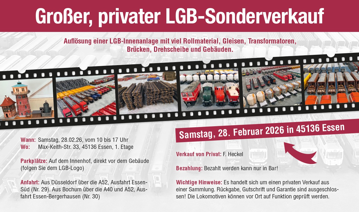 Am Samstag, den 28. Februar 2026, gibt es in Essen einen großen privaten Sonderverkauf. F. Heckel löst eine große LGB-Innenanlage auf. Zahlreiche Lokomotiven, Waggons, Gleise, Transformatoren, Brücken, Drehscheib, Gebäude, etc. geht in den Verkauf.